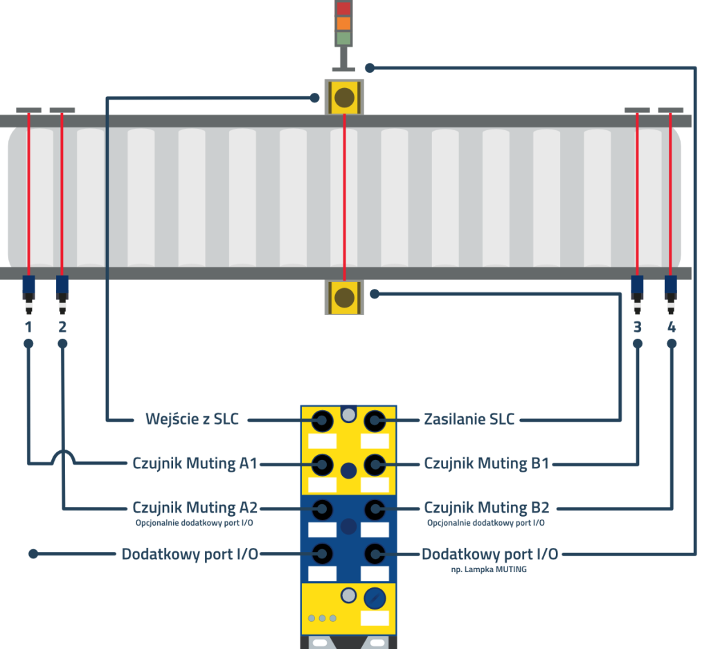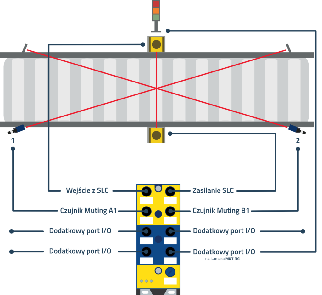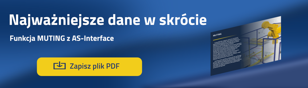 Funkcja MUTING, związana z barierami i kurtynami bezpieczeństwa, jest bardzo często wykorzystywana w aplikacjach intralogoshycznych. Polega ona na czasowym i warunkowym zawieszeniu funkcji zabezpieczenia danej kurtyny świetlnej, umożliwiając tym samym, przetransportowanie materiałów do lub ze strefy zagrożenia. Do aktywacji funkcji Muting wykorzystywane są tzw. Czujniki Mutingu. Są to standardowe binarne sygnały informujące układ bezpieczeństwa, że po spełnieniu określonego warunku, sygnał zatrzymania z kurtyny/bariery bezpieczeństwa powinien być pominięty. Jeśli określony warunek nie jest spełniony to zachowanie systemu bezpieczeństwa pozostaje bez zmian, tzn. przecięcie wiązki powoduje zatrzymanie pracy maszyny/linii.