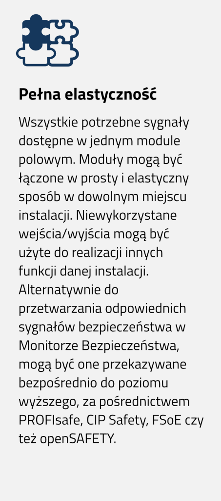 Wszystkie istotne sygnały mogą być wstępnie przetwarzane w Monitorze Bezpieczeństwa lub opcjonalnie przekazywane za pośrednictwem PROFIsafe, CIP Safety, FSoE lub openSAFETY do obróbki w systemie nadrzędnym.